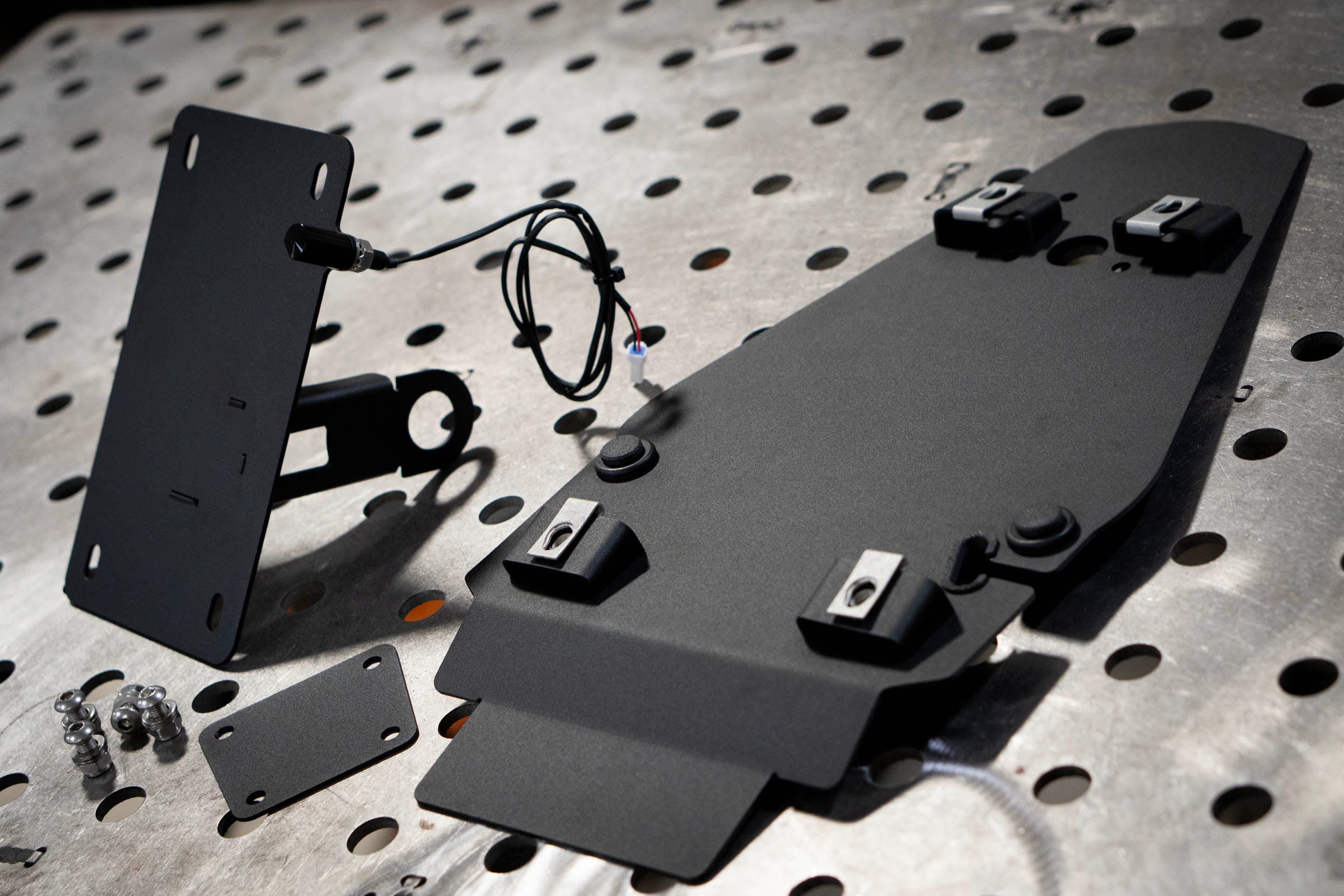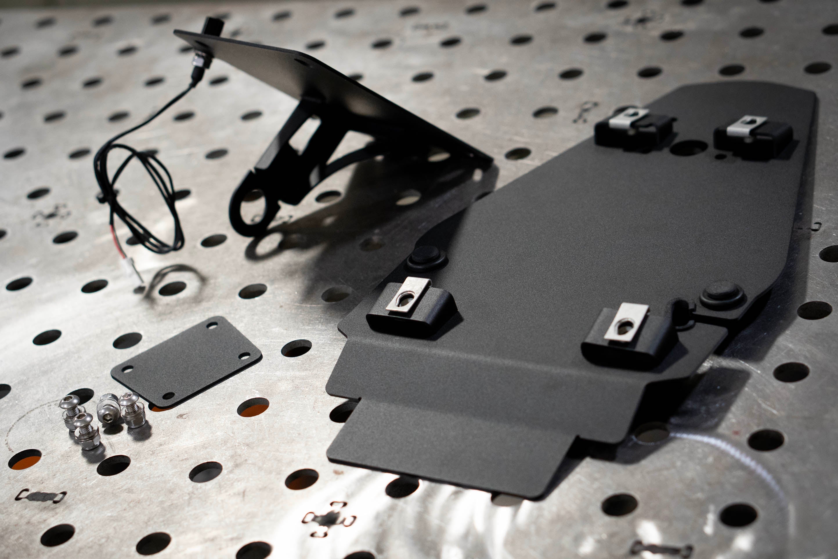 Every kit comes equipped with a pre-wired license plate LED and wired with OEM waterproof connectors, making installation straightforward and reliable. The result is a clean, integrated plate and lighting solution that mounts securely to the axle while maintaining the sleek lines of the bike.