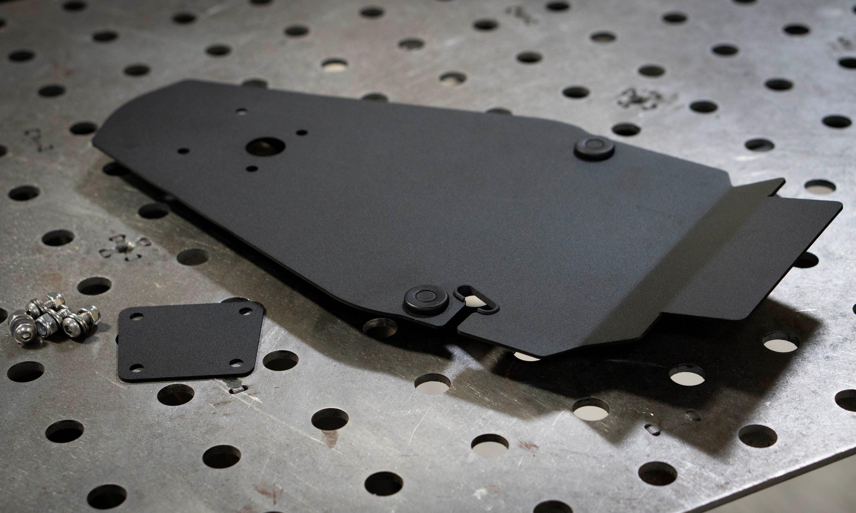 The same level of detail went into our bolt-on Side Axle License Plate Bracket. This two-piece CNC-cut stainless steel design is built specifically for standard 4" x 7" plates. Each bracket is precision-bent, fully TIG-welded for maximum strength, and finished in a durable matte black powder coat.