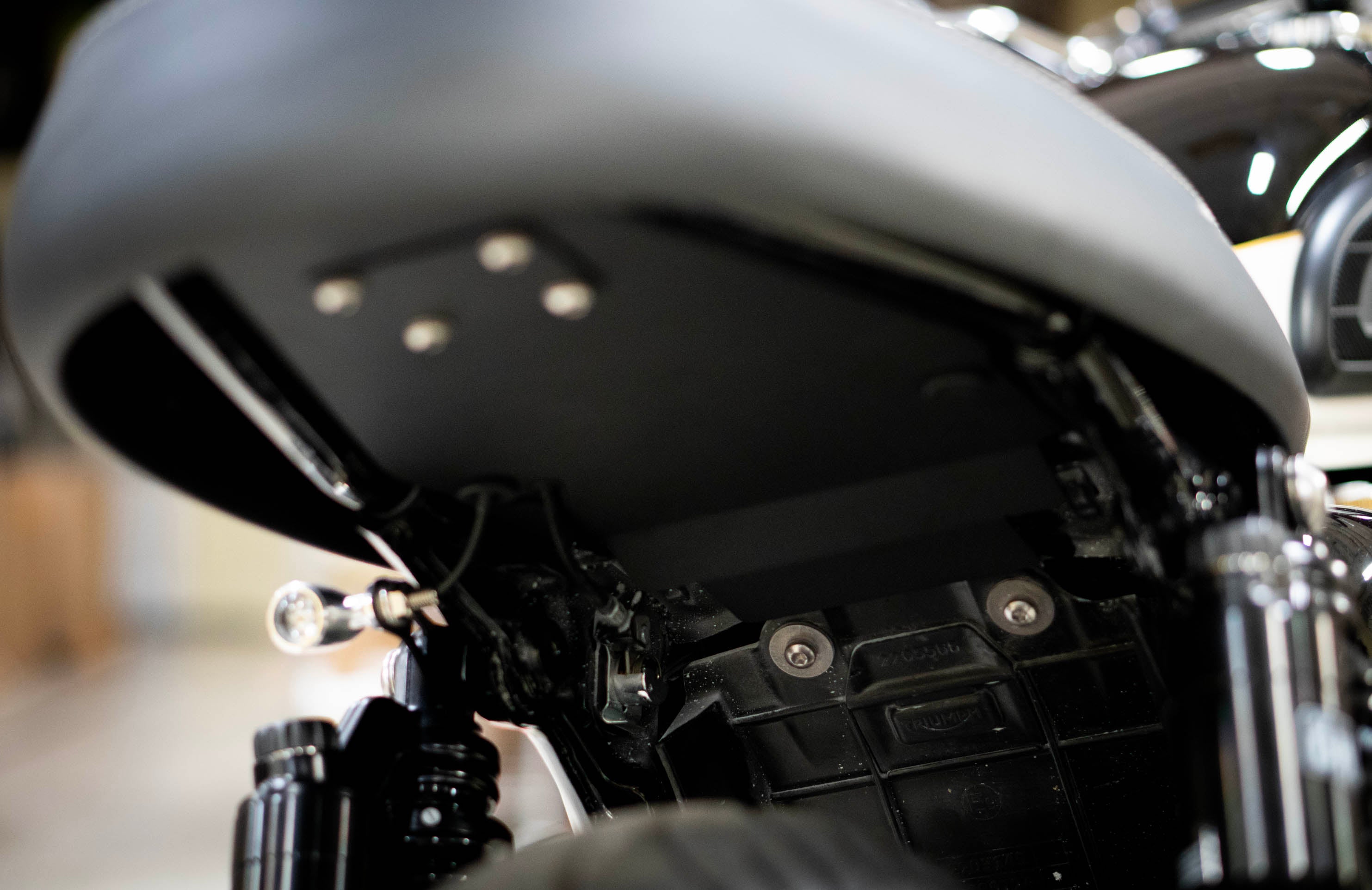 The splash guard begins as CNC laser-cut stainless steel, precision-bent to follow the clean, flat lines of the Triumph frame. Each piece is hand-welded in-house to ensure strength, crisp geometry, and optimal splash protection—as much as you can get without a full fender. All stainless components are finished in a durable matte black powder coat for long-lasting protection and a factory-clean look. Installation is simple and secure, utilizing all four stock mounting points.