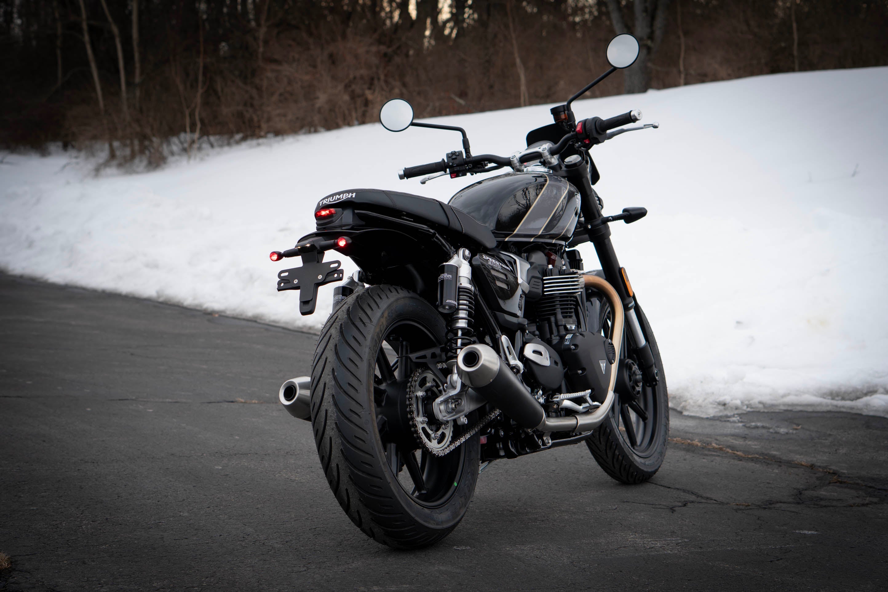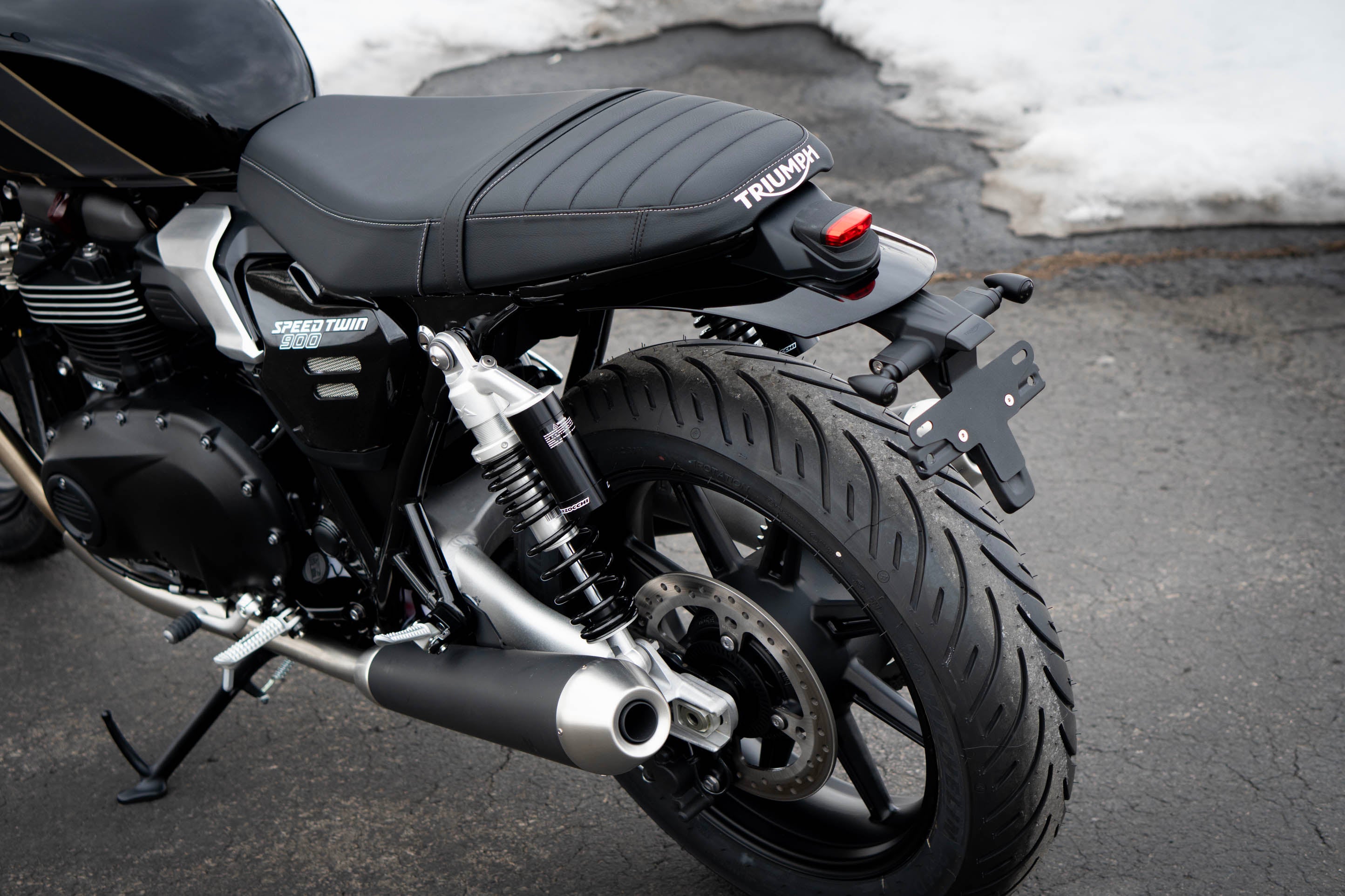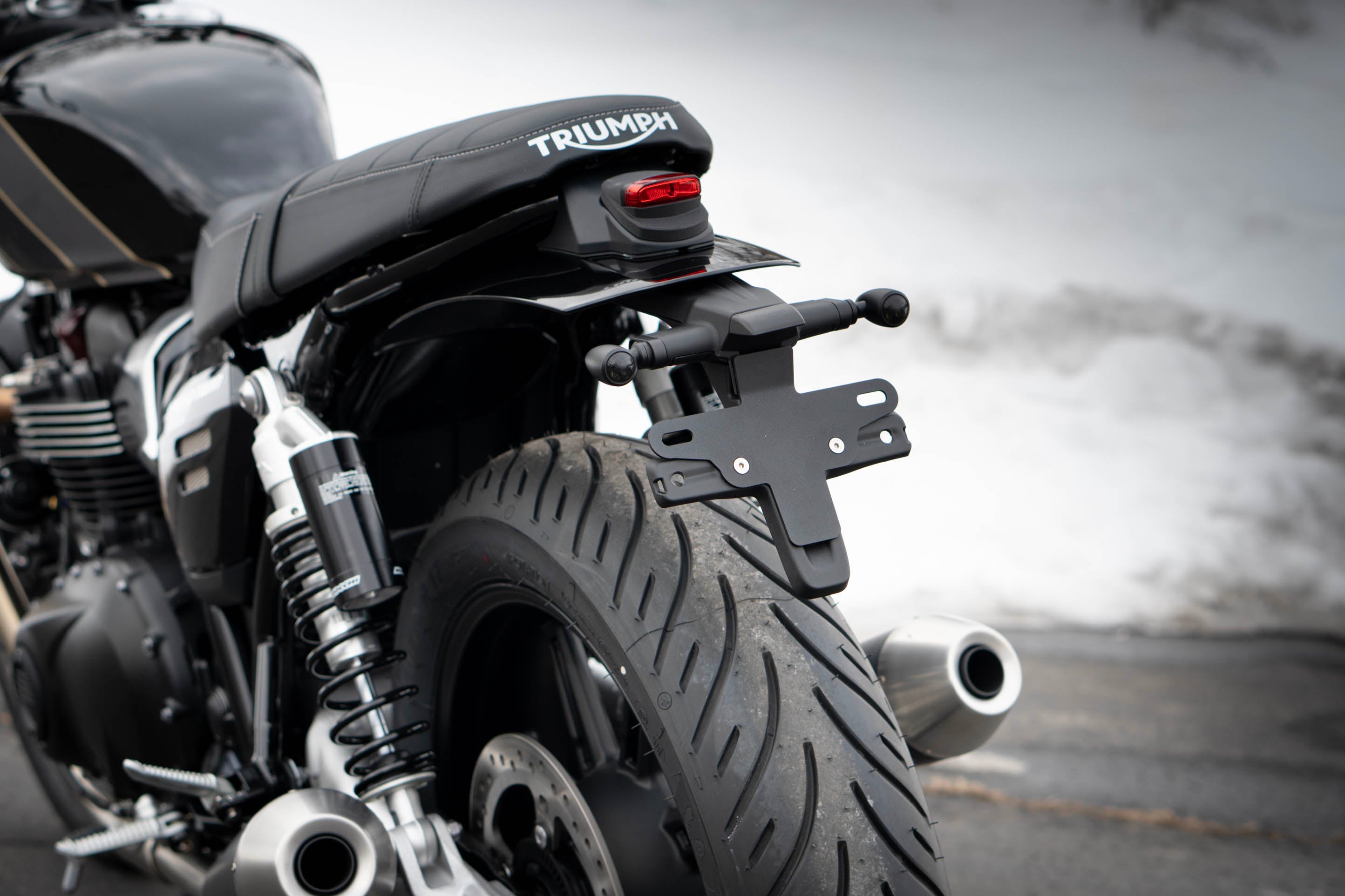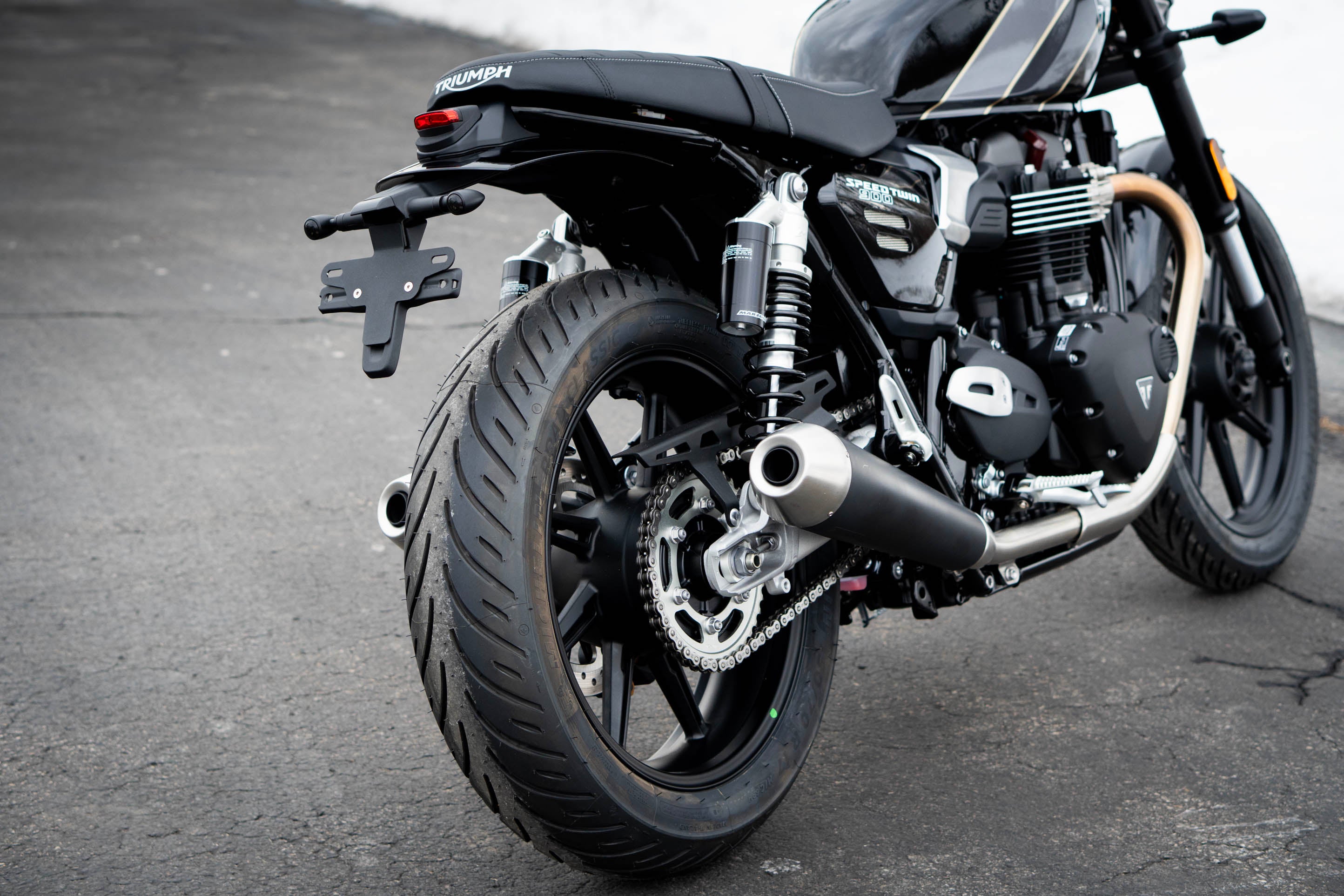 This Speed Twin 900 tail tidy allows you to remove the bulky factory reflectors (or retain them if preferred) and relocates the license plate approximately 1 inch higher than the OEM position for a tighter, more refined appearance.